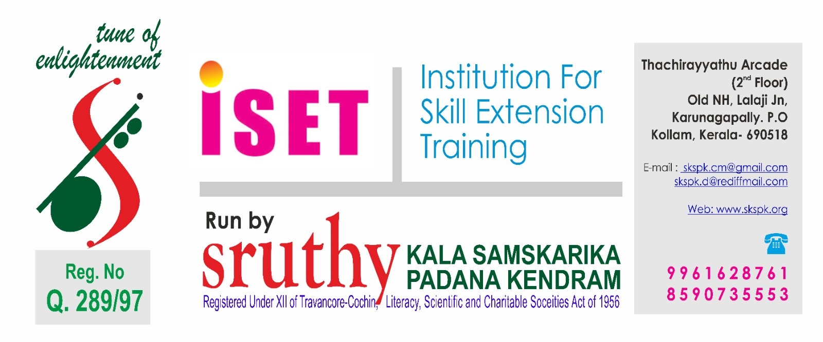 The status of a society is based on its culture which is formed by art and literature. To fulfill this destination we established SRUTHI KALA SAMSKARIKA PADANA KENDRAM on 2nd July 1997 in Thevalakara gramapanchayath. We taught classical arts, folklore and encouraged writings. Famous poet and artists joined in our team to give perfect guidance. The establishment spread widely and became popular. We observed that “Skill development” is essential for youth to achieve profession in order to increase their income. Utilization of human resource is an important factor of economy. So also started ‘Skill development programme in various sectors’ specially focused on women by the year 2004. We developed this as high esteemed professional institution in the name of ISET – (Institution for Skill Extension Training) at Karunagappally by the year 2012. We could generate more than 15000 skilled youths till now. Besides we conduct many charitable activities to empower women, children, old aged person, student and differently abled person. In short this is a sanctuary for youths who seek job, unsecured, women and children.